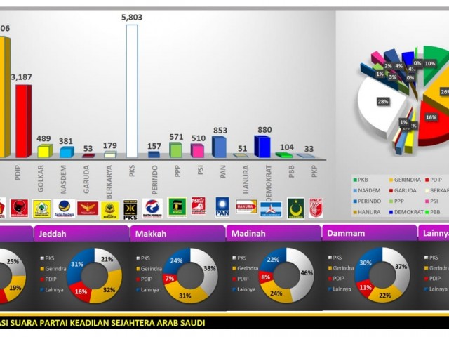 Dari hasil penghitungan surat suara berdasarkan data real count Form C-1 yang dilakukan oleh Tim Tabulasi Data PKS Arab Saudi, PKS menempati urutan pertama dengan perolehan suara sebesar 5,803 atau sekitar 28%, disusul Gerindra dengan perolehan 5.306 suara atau sekitar 26% dan PDIP dengan perolehan 3.187 suara atau sekitar 16%. Sisa perolehan suara dapat dilihat pada data ataupun grafik yang kami lampirkan.