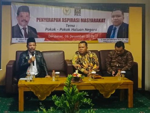 Pada kegiatan serap aspirasi ini, Johan didampingi akademisi dari Fakultas Hukum Universitas Udayana Made Gde Karma Resen yang menyampaikan materi berjudul Refeleksi Rasionalitas Mencapai Kesejahteraan Umum (Meramu Agenda Masa Depan).