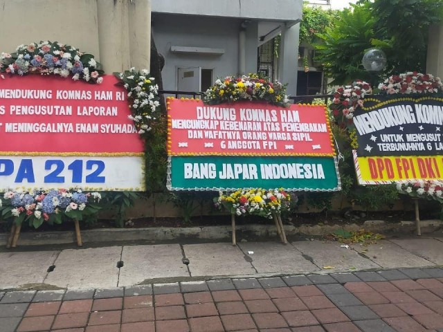 JAKARTA (voa-islam.com)--Kantor Komisi Nasional Hak Azasi Manusia (Komnas HAM) di Jalan Latuharhary No.4b Menteng, Jakarta Pusat kebanjiran kiriman karangan bunga. Karangan bungan berisi dukungan kepada Komnas HAM untuk mengusut kasus penembakan enam laskar Front Pembela Islam (FPI).