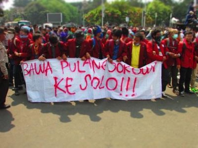 Nampak juga BEM SI membawa spanduk dalam bahasa jawa 'Ndang Balio nang Solo, Pak' atau Ayo buruan pulang ke Solo Pak (Jokowi). (Robigusta Suryanto/voa-islam.com)