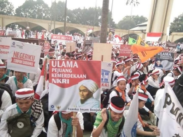 BANDUNG (voa-islam.com) - Ratusan Santri Daarut Tauhid (DT) hadiri acara Apel Nusantara Bersatu di Lapang Gasibu, Bandung pada Rabu pagi, (30/11). Sepanjang rombongan, tampak para santri mengangkat puluhan poster bergambarkan poto para pahlawan.