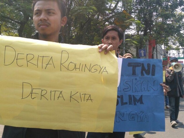 Di Cimahi puluhan Mahasiswa yang tergabung dalam Forum Diskusi Pemuda dan Mahasiswa (FDPM) Cimahi melakukan aksi damai solidaritas untuk muslim Rohingya, bertajuk "Derita muslim Rohingya Derita Kita".