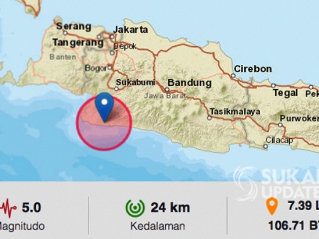 Gempa kali ini mengguncang wilayah Kabupaten Sukabumi. Sore ini gempa terjadi pukul 15.22 WIB dari kedalaman 24 kilometer.