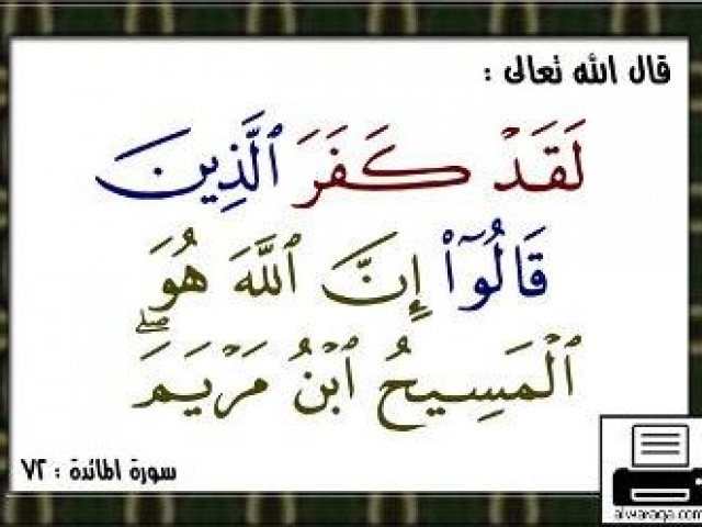 لَقَدْ كَفَرَ الَّذِينَ قَالُوا إِنَّ اللَّهَ هُوَ الْمَسِيحُ ابْنُ مَرْيَمَ وَقَالَ الْمَسِيحُ يَا بَنِي إِسْرَائِيلَ اعْبُدُوا اللَّهَ رَبِّي وَرَبَّكُمْ إِنَّهُ ُ مَنْ يُشْرِكْ بِاللَّهِ فَقَدْ حَرَّمَ اللَّهُ عَلَيْهِ الْجَنَّةَ وَمَأْوَاهُ النَّارُ وَمَا لِلظَّالِمِينَ مِنْ أَنْصَارٍ