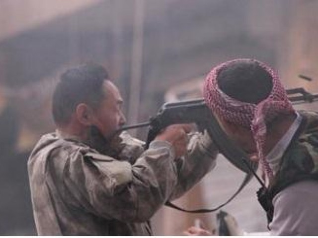 Toshifumi Fujimoto (tengah) berfoto bersama mujahidin Suriah sambil menenteng senapan serbu dan kamera.