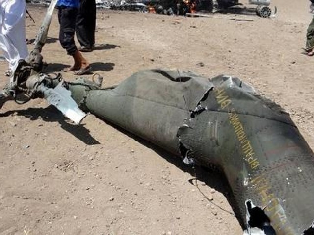 Potongan-potongan gambar yang diposting secara online menenjukkan helikopter tersebut hancur terbakar menjadi puing-puing di sebuah daerah gurun berpasir.