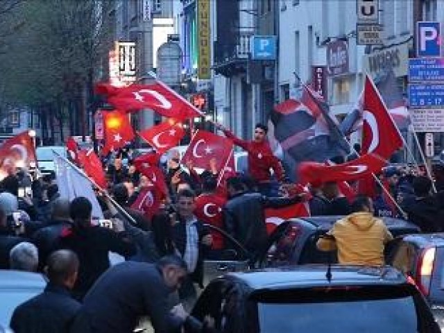 Perayaan di Brussels berlangsung di sepanjang jalan Chaussee de Haecht yang penduduknya Turki di bawah pengawasan polisi ketika warga Turki navigasikan daerah itu dengan nyanyian dan membawa spanduk dari Erdogan.