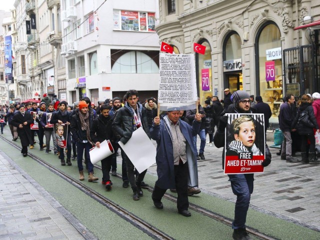 Ratusan orang mulai berjalan dengan membawa spanduk dalam bahasa Turki, Inggris, Arab, dan Ibrani untuk menuntut kebebasan dari Fawzi Al-Juneidi dan Ahed Al-Tamimi.