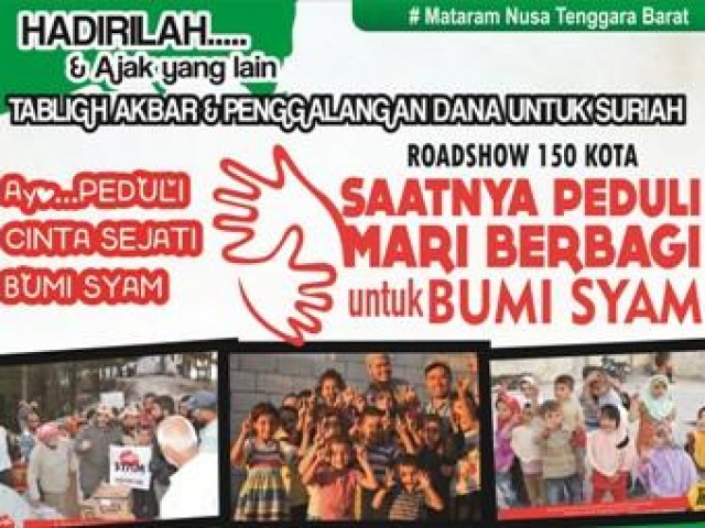 Syam Organizer terus semangat membangkitkan kesadaran umat terhadap bumi Syam yang diberkahi. Di bumi para anbiya’ tersebut, kebangkitan Islam akan berawal. Program roadshow 150 kota ''saatnya peduli mari berbagi untuk bumi Syam’’ yang sudah berjalan tiba giliran di kota Mataram, Lombok, Nusa Tenggara Barat (NTB).