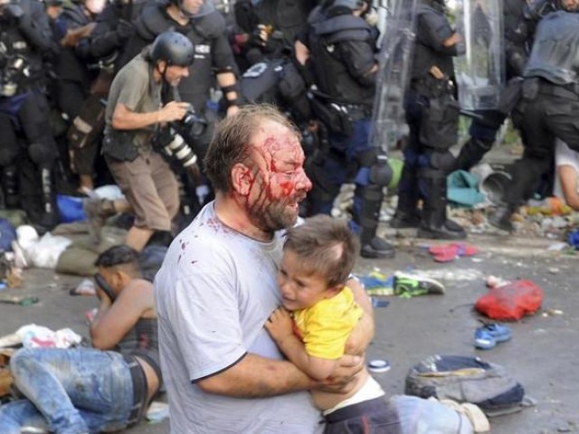 Polisi anti huru hara di Hongaria - menghadapi lebih dari 200.000 imigran tahun ini, hampir semua dari mereka menuju ke negara-negara Uni Eropa lainnya. Polisi dengan sangat keras dan menembakkan gas air mata, menyemprotkan meriam air di kerumunan besar migran putus asa untuk menyeberangi perbatasan dari Serbia, Rabu, 16/9/2015.