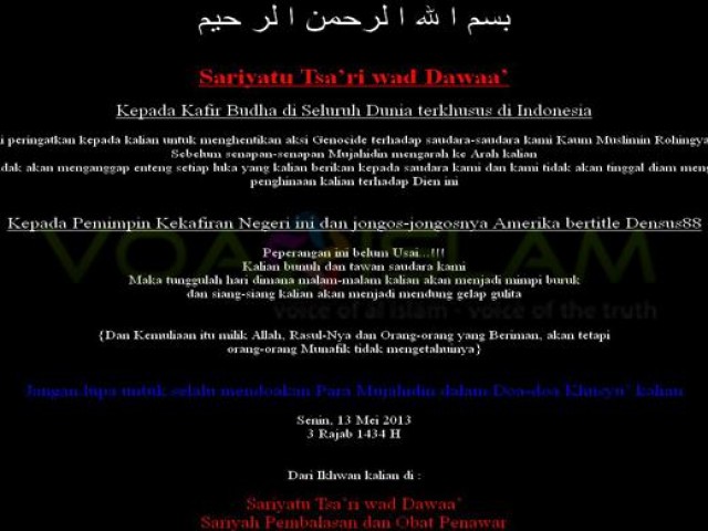 Sebuah situs milik umat Buddha dan satu milik pemerintah diretas oleh mujahidin yang menamakan dirinya Sariyatu Tsa’ri wad Dawaa’ (Pasukan Kecil untuk Pembalasan dan Obat Penawar).
