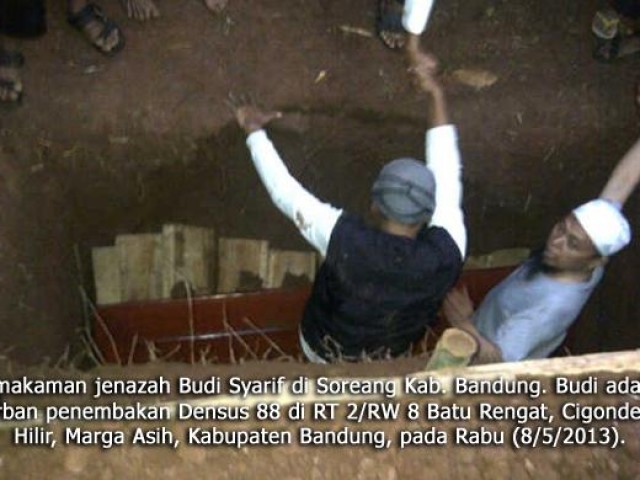 SOREANG (voa-islam.com) - Setelah menunggu berhari-hari akhirnya jenazah Budi Syarif Aminuddin, salah satu korban meninggal dari penggerebekan Densus 88 di sebuah rumah kontrakan di Cigondewah, Bandung tiba kediaman kerabatnya di Kampung Pasir Salam RT 02 RW 04 Desa Sukanagara, Kecamatan Soreang, Kabupaten Bandung, Jum’at sore (17/05/2013) sekitar pukul 15.30 WIB.