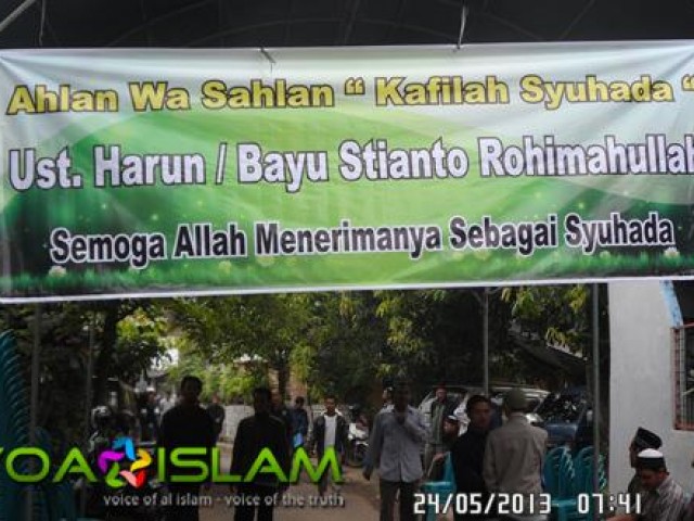 Sedangkan dari sebuah gang yang hendak masuk ke rumah Bayu dan didepan rumah Bayu ada pula spanduk bertuliskan “Ahlan Wa Sahlan Kafilah Syuhada Ust. Harun / Bayu Setianto Rohimahullah (Semoga Allah Menerimanya Sebagai Syuhada)”.