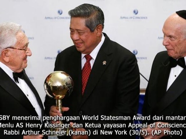 Kini SBY menerima penghargaan bertajuk "Statesman Award" di Hotel The Pierre, New York, Amerika Serikat, pada Kamis malam, 30 Mei 2013, waktu setempat. Sebuah penghargaan yang dianugerahkan oleh organisasi lintas keyakinan, The Appeal of Conscience Foundation (ACF).