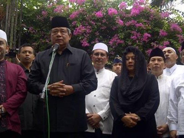 Linangan air mata tampak di kelopak, dan mata SBY memerah. Namun, SBY berusaha tegar. Presiden Republik Indonesia ini menyampaikan ucapan turut berduka atas kepergian seorang ulama pimpinan majelis zikir Majelis Rasulullah SAW.