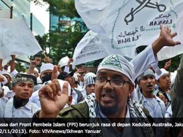 JAKARTA (voa-islam.com) Ratusan massa Front Pembela Islam (FPI) dan Hizbut Tahrir Indonesia (HTI) mengeruduk Kedutaan Besar (Kedubes) Australia yang dulu pernah di bom pada 9 September 2004 lalu Rois dan Heri Golun.