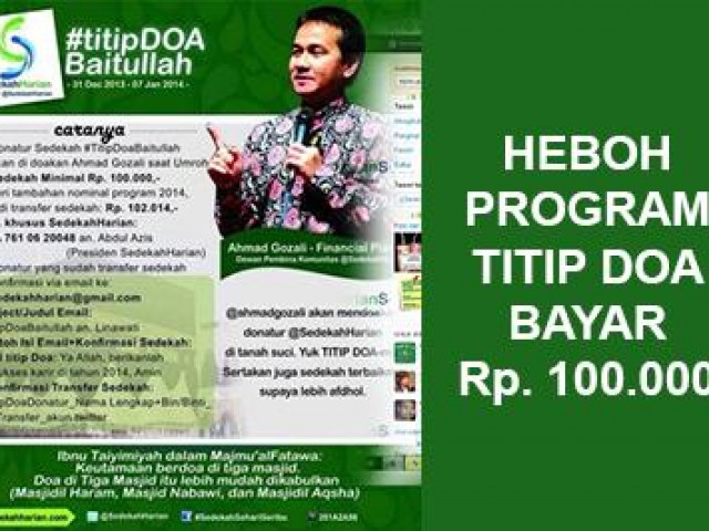 Ironisnya, donatur yang ingin di doakan diwajibkan mentransfer sedekah senilai Rp100.000 plus tambahan nominal Rp2.014. Dalam iklan Sedekah Harian itu dijelaskan, para donatur yang menitipkan doa ke Ahmad Gozali bisa mengirimkan apa yang ingin didoakan via email.