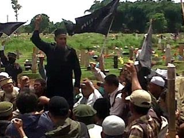 Umat Islam berkumpul mengeliling makam ke lima aktivis korban tembak mati Densus 88 saat akan mendengarkan tausiyah.