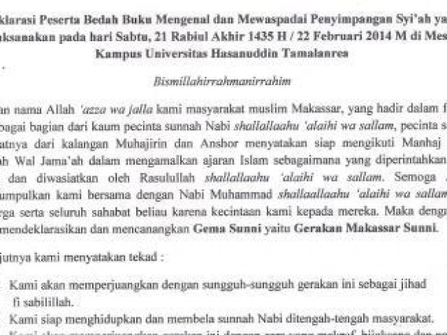 MAKASSAR (voa-islam.com) – Berkumpulnya ribuan Umat Muslim Ahlussunnah di acara Bedah Buku Nasional (BBN) “Panduan MUI, Mengenal dan Mewaspadai Penyimpangan Syiah di Indonesia” pada hari Sabtu, (22/02/ 2014) lalu dimanfaatkan tokoh dan ulama Makassar untuk mengajak ummat membentengi aqidah ummat dari aliran-aliran sesat terutama Syi’ah Rafidhoh.