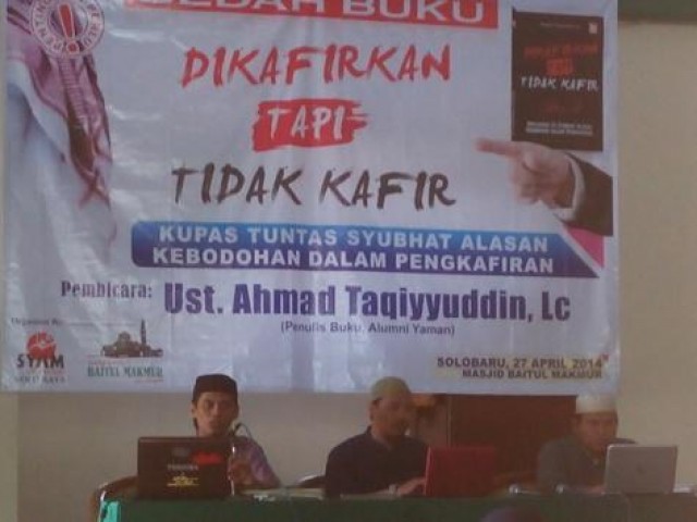 SUKOHARJO (Voa Islam) – Buku berjudul “Dikafirkan Tapi Tidak Kafir” tadi pagi, ahad (27/04/2014) dibedah oleh penulisnya sendiri, Ustadz Ahmad Taqiuddin, Lc. Acara Bedah Buku yang diadakan di mesjid Baitul Makmur, Solobaru, Sukoharjo ini juga menghadirkan Ustadz Mas’ud Izzul Mujahid, Lc, pemimpin redaksi majalah An Najah. Ustadz Mas’ud sendiri juga sudah menulis sebuah buku yang berjudul “ Vonis Kafir , Antara berlebih-lebihan dan Ketidaktegasan.”