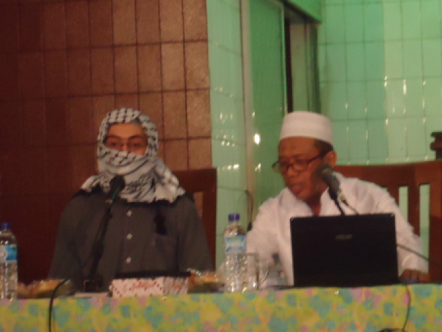Setelah Dua pembicara menyampaikan Materi, tiba waktunya pembicara ketiga, dengan memakai jubah serta menutup wajahnya sebagai mana mujahidin, masjid Mujahidin Surabaya mengema dengan gemuruh suara takbir menyambut mujahidin asal Iraq ini.