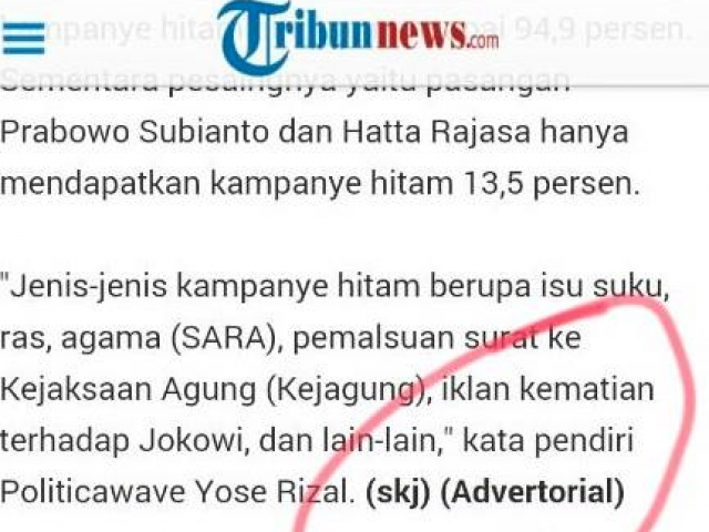 JAKARTA (voa-islam.com) - Pada Jumat, 13 Juni 2014 tepatnya pukul 16:47 WIB saya tak sengaja membaca sebuah artikel dengan judul Jokowi JK Dewan Pers: Bukan Pers, “Obor Rakyat” Bisa Dipidanakan. di laman http://www.tribunnews.com/ setelah secara seksama saya baca kalimat ujungnya tertulis Advertorial.
