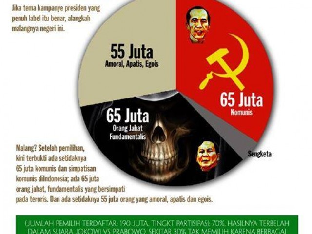 Menurut Farid Gaban, dari fakta saling serang kampanye yang terungkap "Kubu Jokowi di beri label komunis. Kubu Prabowo disebut sarang fundamentalis/teroris. Kubu Golput dibilang amoral dan tidak nasionalis. Lengkap sudah. Hehehe...."