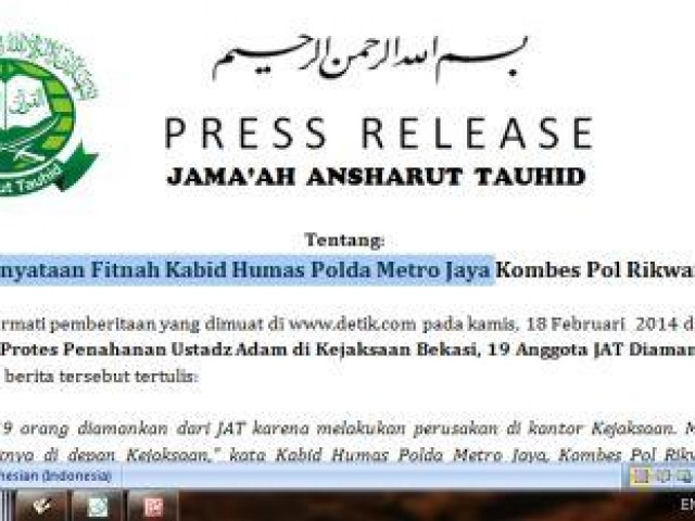 Kutipan tersebut merupakan fitnah yang kembali dilakukan pihak kepolisian terhadap JAT, maka kami sangat keberatan dimuatnya kutipan tersebut, terlebih tidak adanya konfirmasi kepada kami baik dari pihak kepolisian maupun detik.com sebagai bentuk cover both side yang sangat diperhatikan dalam sebuah kode etik jurnalistik.