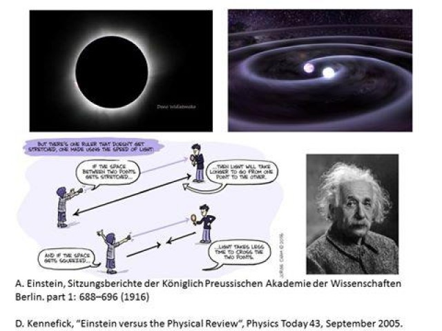 Albert Einstein yang pertama merumuskan gelombang ini tahun 1916. Tidak banyak yang tahu kalau pada 1936 dia justru menulis paper yang mengatakan gelombang ini *TIDAK* ada. Ketika dia kirim papernya untuk dimuat di jurnal, reviewer (kritikus) papernya menulis kalau hitung-hitungan Einstein salah. Einstein marah dan mengatakan bahwa tidak boleh ada orang lain yang membaca papernya sebelum terbit! Dia tarik papernya dari jurnal itu. Namun ternyata beberapa bulan kemudian Einstein menemukan kalau hitungannya ternyata memang salah!