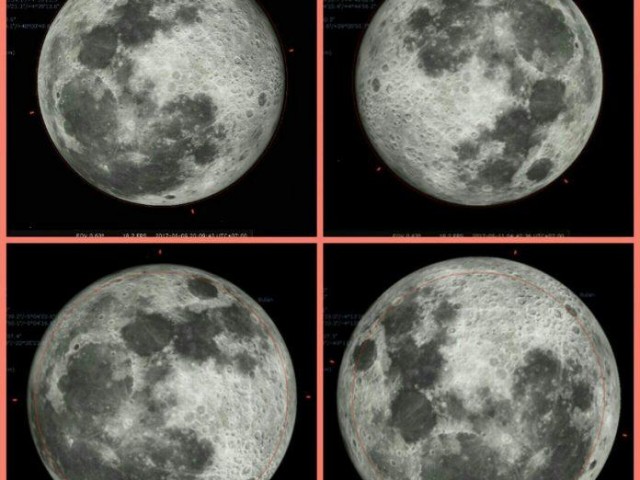 Perbandingan antar Average Moon (9/6/2017), Mini Moon (11/5/2017), Super Moon 2 (4/11/2017) dan Super Moon 1/ Super Moon ‘Sejati’ (3/12/2017) menggunakan Stellarium dengan FOV 0,63°.. Terlihat memang Super Moon di Bulan Desember 2017 adalah yg terbesar di tahun ini. [persis.or.id/syahid/voa-islam.com]