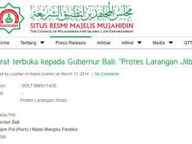 Adanya pelarangan mengenakan Busana Taqwa (jilbab) bagi para pelajar Muslimah SMP, SMA, dan PT di Bali, kami dari Majelis Mujahidin sangat prihatin dan melakukan protes keras. Mengapa lembaga pendidikan di Propinsi Bali menerapkan kebijakan sektarian yang dapat memicu SARA dan melanggar HAM, justru disaat para pelajar negara kita sedang dilanda degradasi moral dan kriminal?