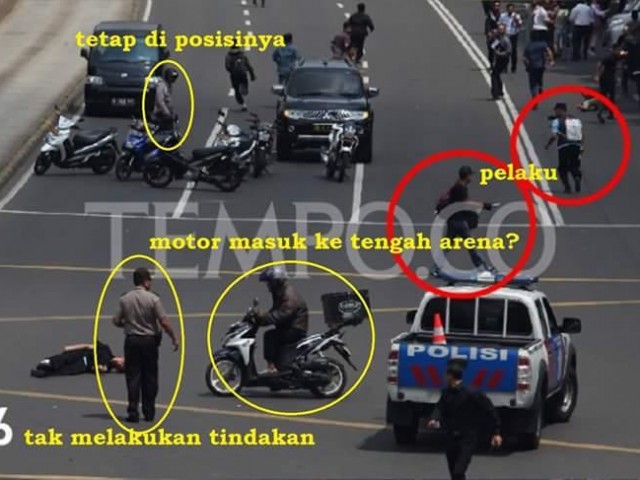 JAKARTA (voa-islam.com) - Kembali netizen mengungkapkan kisah dibalik foto yang tersebar di dunia maya, sepuluh ini mencoba menarik hipotesa akan aksi #teroristainment diperempatan Sarinah, Jakarta Kamis (14/1).
