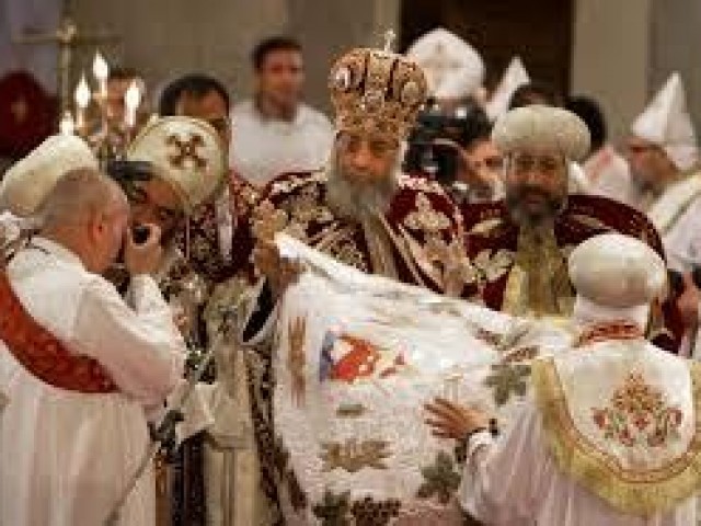 Ket: Pemimpin tertinggi Gereja Kristen Koptik Mesir, Paus Tawadros II (tengah) dalam sebuah acara