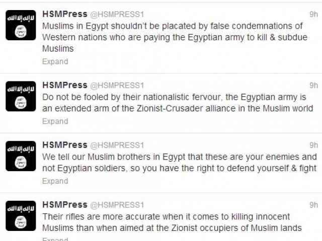 "Kami memberitahu saudara-saudara Muslim kami di Mesir bahwa ini adalah musuh Anda, sehingga Anda memiliki hak untuk membela diri & melawan. Jangan tertipu oleh semangat kebangsaan mereka, militer Mesir adalah perpanjangan tangan dari aliasi Zionis-salibis di dunia Muslim.