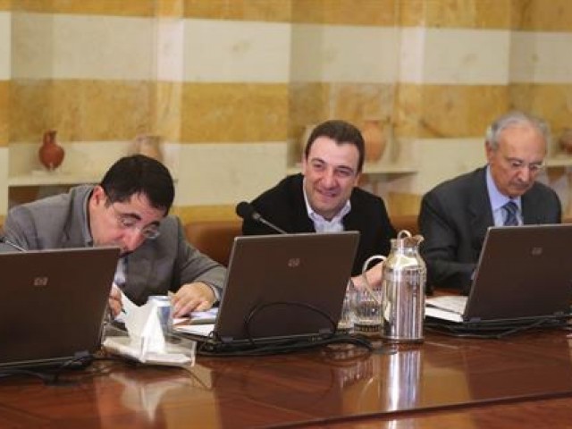 Ket: Menteri Libanon (dari kiri) Hussein Hajj Hasan, Wael Abu Faour dan Mohammad Safadi saat pertemuan kabinet