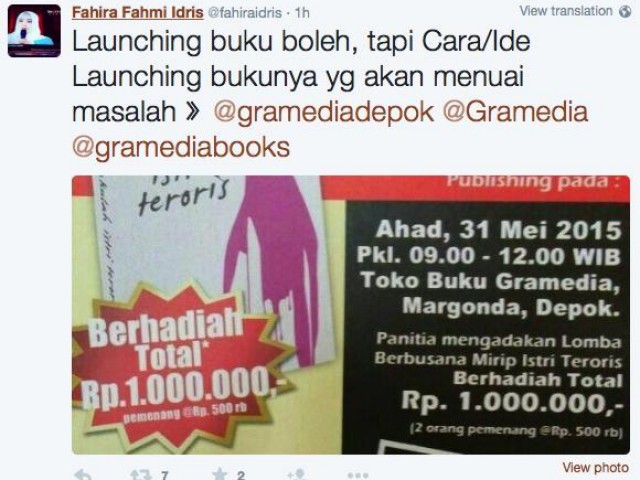 Ia pun menyatakan akan datangi Gramedia Depok jika acara ini benar digelar, "Kepada @gramediadepok @Gramedia @gramediabooks saran sy: batalkan acara "Lomba Berbusana Mirip Istri Teroris" ini..